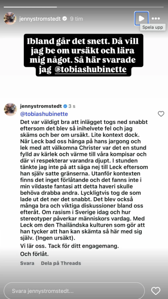 I ett svar till Tobias Hübinette, forskare och aktivist skriver Jenny på Instagram: