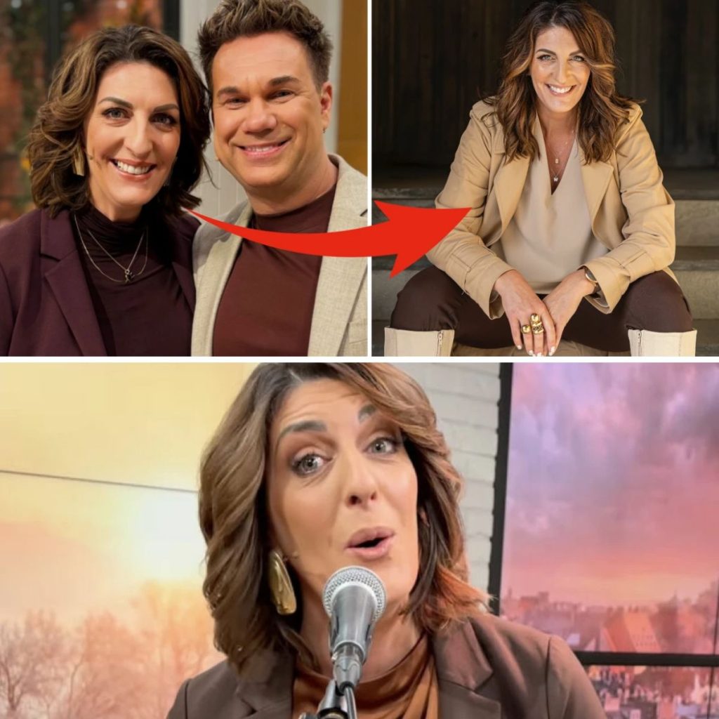 Soraya Lavasani satsar helhjärtat när hon framför sin sång i Nyhetsmorgon – till kollegernas skratt. Foto:Skärmdump TV4