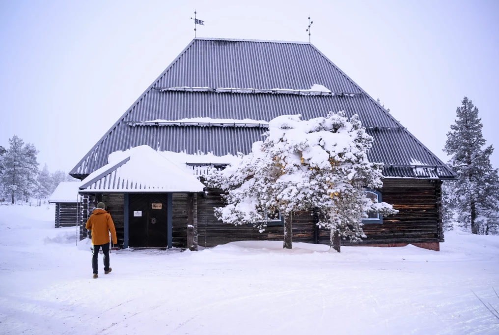 Kronprinsessan Victoria och kungen med ärkebiskop Martin Modeus inför gudstjänst i Sälens Fjällkyrka